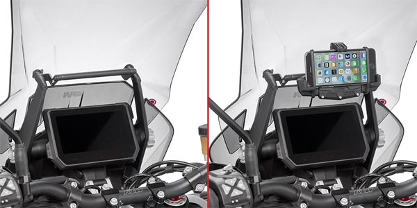 This handy little bracket provides the support needed to mount a sat-nav, smartphone holder or any gadget in the best position, i.e. above the control panel, avoiding the need to look down at a device whilst riding. Mounting behind the bike’s screen, it is compatible with both the original screen and the GIVI range of screens. Fits specific models of adventure bikes – search My Motorcycle on Givi's website to check availability on your bike.