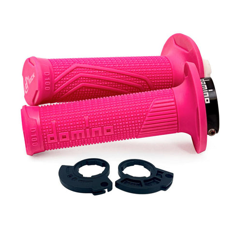 New from Italian manufacturer Domino are D-Lock grips. Made in Italy by world renowned grip manufacturer, Domino, these grips feature a unique Lock On fixing system. Assembly is fast, practical and does not require glue, compressed air or lock wire on either the left, or right side thanks to the D-Lock ring and interchangeable pulleys. Track tested to ensure unbeatable performance, D-Lock grips come in two variations with different colour options for each.