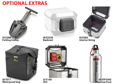 Alaska cases attach using Givi's patented and time proven Monokey system, which allows the use of a single key for opening the lid, as well as for releasing the case from its mounting plate. Particular care has been given to ensuring the product is durable and repairable: the removal system, the stabilisers at the bottom, the base and other components can be easily replaced, greatly extending the useful life of your top case. Available in two finishes, natural silver or matt black painted aluminium.
