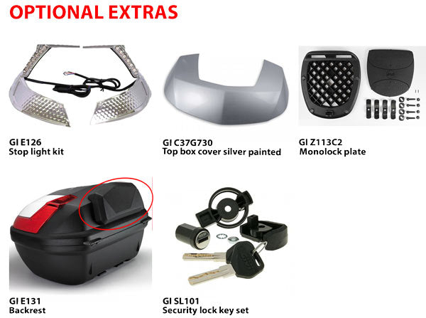 Givi B37NT Blade is a 37 lt case able to hold one helmet.  Comes with smoked reflectors. Universal mounting plate included. Maximum loading of 3kg.